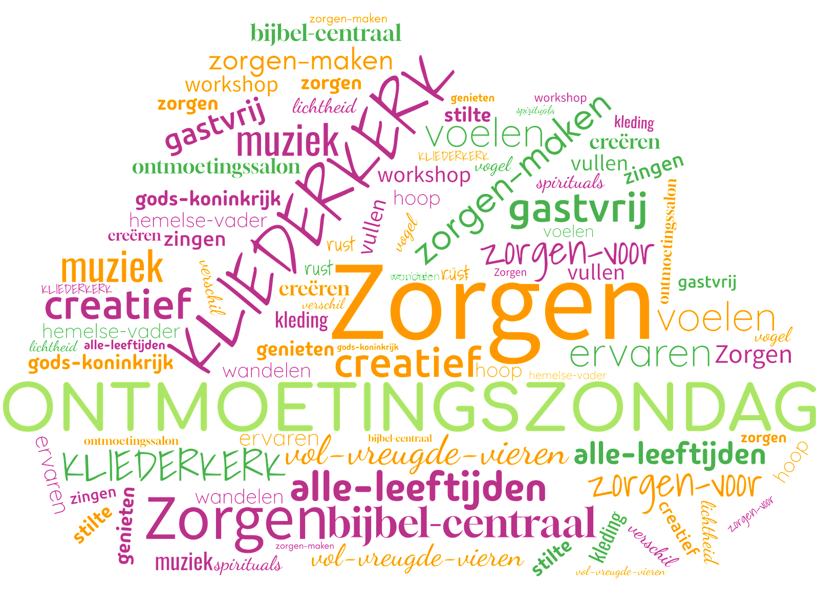 Kom naar de Ontmoetingszondag op 1 februari 20261 februari 2026 van 10.00 tot 12.30 uur We gaan het verhaal van Matteüs 6: 25-34 in diverse werkvormen ervaren. Centraal staat het thema ‘ZORGEN’. Het verhaal wordt niet gelezen, maar we gaan het beleven..; door te doen. De werkvormen zijn heel divers en daardoor voor elke leeftijd geschikt. Na de viering sluiten we af met een gezamenlijke maaltijd. 10.00 uur Welkom en korte uitleg 10.15 uur ‘Zorgen’ ervaren in allerlei werkvormen 11.00 uur Samen vieren 11.30 uur Koffie / thee / limonade 11.45 uur Samen eten ![]() ---------------------------------------------------------------------------------------- Ontmoetingszondag op 1 februari 2026 Deze zondag vieren wij geen gewone dienst, maar toch staat zoals iedere zondag ook in deze dienst God centraal, staan de Bijbel en geloof centraal. Deze zondag is de kerk anders – een beetje onwennig misschien, een beetje ondeugend, maar vooral bijzonder. Een ochtend voor jong en oud met veel meer ruimte voor gezinnen dan op andere zondagen. Een soort quality-time waarin je met alle zintuigen het geloof kunt beleven. In Nederland is deze frisse vorm van kerk-zijn bekend geworden als ‘kliederkerk’ – maar wees gerust, je hoeft niet te kliederen, al mag het wel. Je hoeft ook niet zo veel met het geloof te hebben – het gaat veel meer om beleven. Hoe ziet de dag eruit? We beginnen met een welkom en een uitleg. Het thema van deze zondag zal bij de uitleg alvast even klinken: ZORGEN. En dan gaan we uit elkaar om ‘zorgen’ met elkaar te beleven. Voor iedereen is er iets te doen om op verschillende manieren een aspect van ‘zorgen’ mee te maken. Vervolgens is er een tijd van vieren met muziek, misschien iets vanuit de beleving en ook een stukje creatieve verkondiging. De afsluiting is een gezamenlijke maaltijd. Kom en laat je verrassen!! ![]() Wat is het eigenlijk? Deze ontmoetingszondag is geen nieuwe vorm van kinderkerk, maar een kans voor jong en oud om samen het geloof (opnieuw) te ontdekken! Vijf waarden staan centraal bij de kliederkerk: